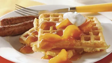 For each waffle, pour batter onto center of hot waffle iron. (Check manufacturer's directions for recommended amount of batter.) Close lid of waffle iron. Bake 3 to 5 minutes or until steaming stops. Carefully remove waffle. Serve waffles with topping.