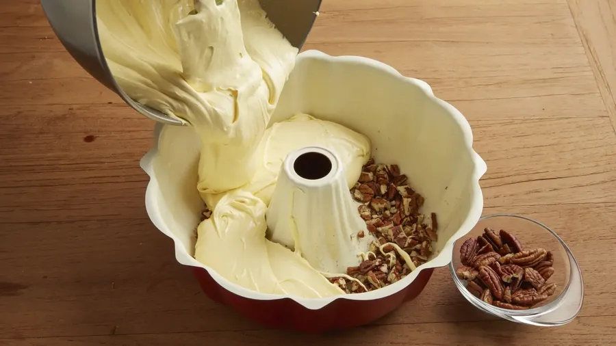 Pre-heat oven to 325 °F. Grease and coat a Bundt pan with flour. Sprinkle the pecans over the bottom of the pan.