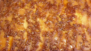 When the cake is ready, remove from the oven and immediately poke the flat base with a toothpick. While still hot and without unmolding, pour a bit of the syrup over the cake to let it soak in.