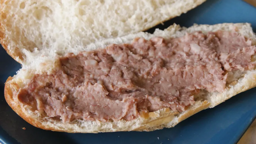 Take a roll and cut it in half. Cover the rolls with a layer of beans.