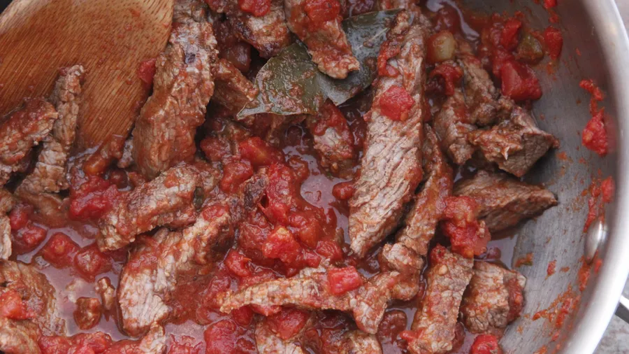 Cut the meat into thin strips and add them to the tomato sauce. Cover and let it cook for 3 more minutes.