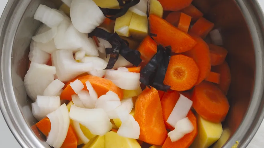 Heat the olive oil in a pot. Add the chile ancho, carrots, onion, and potatoes. Brown slightly and add the bay leaf. Add the vegetable broth or water, and take to a boil.
