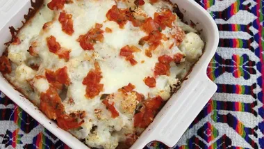 Bake for 18 minutes at 400 °F, take the tray out of the oven and sprinkle the cauliflower with the remaining 3/4 cup of cheese.