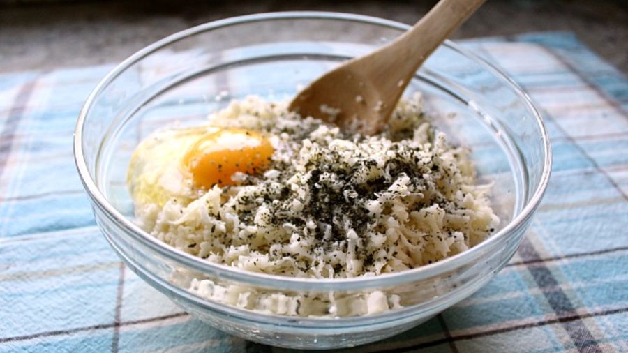 Add the egg, 1/2 cup cheese, basil, oregano, black pepper and a pinch of salt. Mix all of the ingredients.
