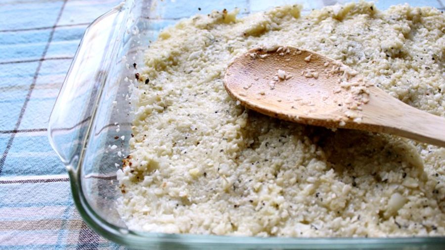 Preheat the oven to 400 °F. In a food processor pulse the cauliflower until you get a rice-like texture. Transfer the cauliflower to a baking dish and bake for 20 minutes.