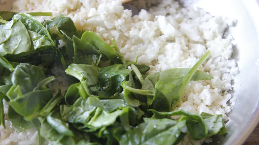 Add the cauliflower “rice” and the spinach, season with salt and pepper to taste and cook for 3-5 minutes until you get the desired consistency: 3 minutes if you want a crunchy cauliflower or 5 if you want it softer.
