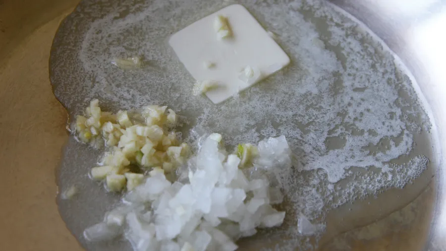 Fry the garlic and chopped onion in the butter until the garlic is golden brown and the onion is soft.
