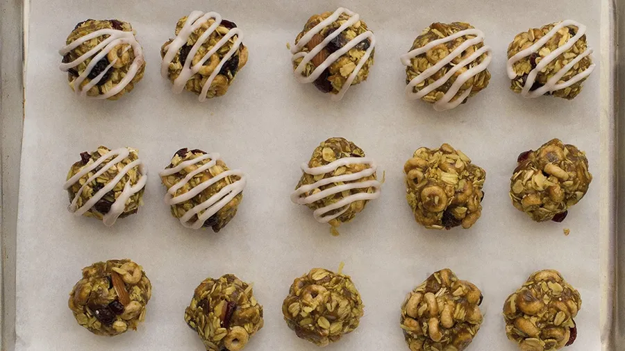 Spoon in yogurt mixture in a sandwich plastic bag. Snip a small hole in one of the corners. Drizzle yogurt mixture on cereal bites or dip half way thru. Return drizzled cereal balls to the prepared sheet and let yogurt drizzle set for at least 30 minutes.