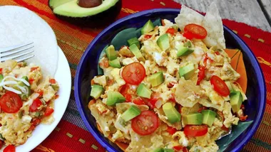 Return crisp tortillas to pan, add eggs and scramble until eggs coat tortillas and set, about 3 minutes. Serve warm with cheese.