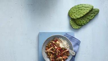 Heat oil in large skillet and brown chicken. Add citrus juice, onion and bell pepper and let cook down slightly.