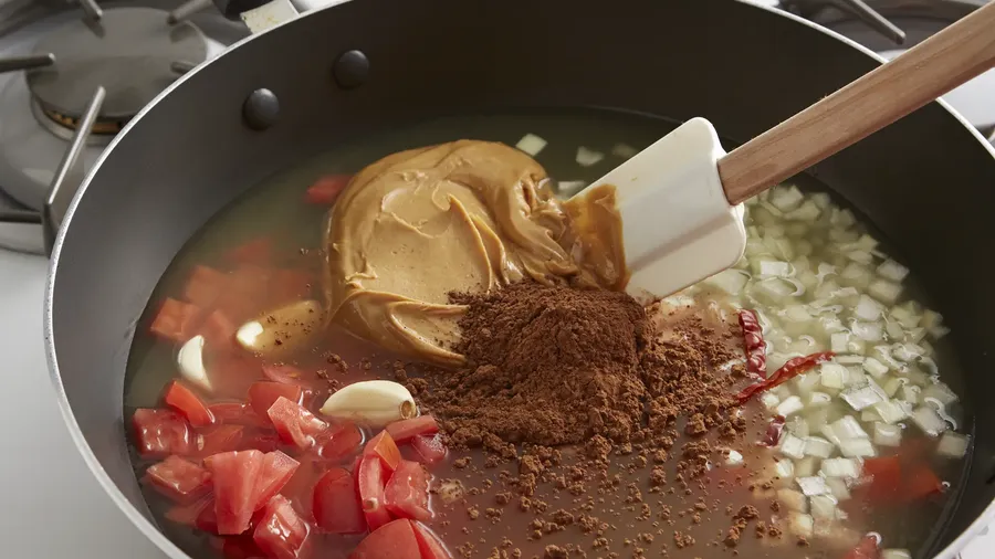 Add tomatoes, onion, garlic, peanuts, chicken broth and cocoa to pan at medium heat. Cut stem from the dried chile, slit it open and remove all the seeds. Add the chile to the pan. Allow mixture to simmer for 25 minutes. After 25 minutes, turn off the heat and let the sauce cool off.