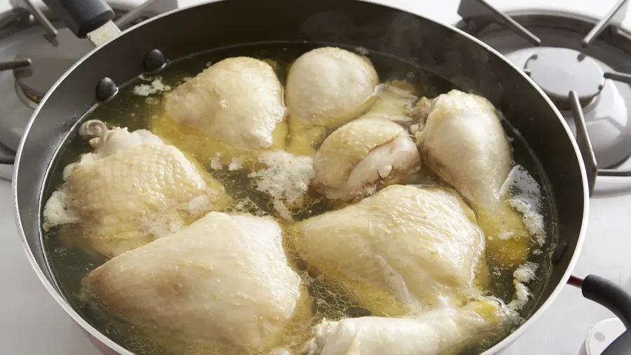 Place chicken in large pan at high heat, add water and let simmer for 20 minutes. Remove the chicken from pan and throw out any remaining water.