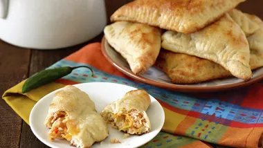 Unroll 2 crescent triangles and spread them out to form 1 square. Place 1/4 cup chicken, a few strips of poblano pepper and 1 tablespoon of cheese in the center of the square.