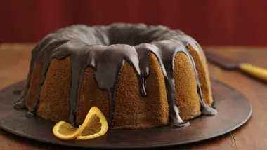 In large bowl, beat 1 cup butter and the granulated sugar with electric mixer on medium speed until blended. Beat in melted chocolate. Add sour cream, orange peel, vanilla and eggs; beat until well blended. On low speed, beat in remaining cake ingredients. Spread batter in pan.