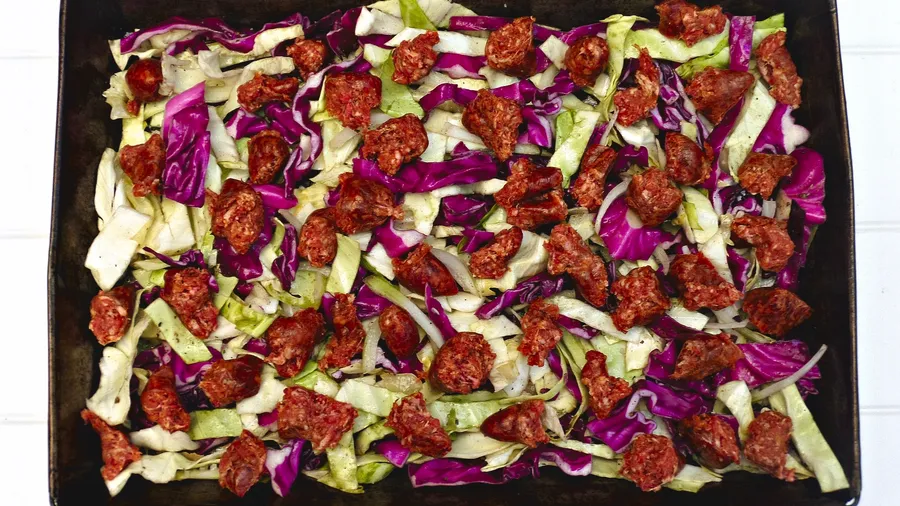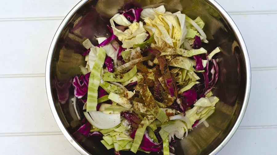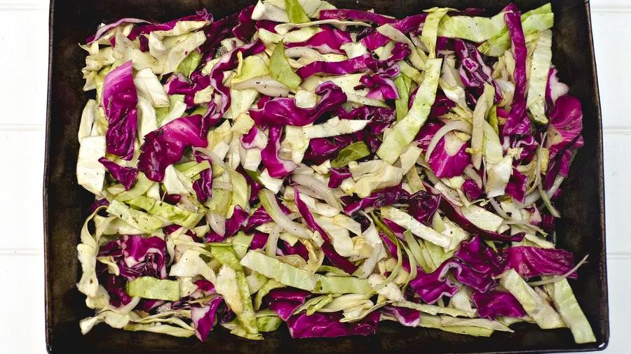 Heat oven to 425 °F. Mix the green cabbage, red cabbage, onion, olive oil, salt, cumin and oregano in a large bowl.