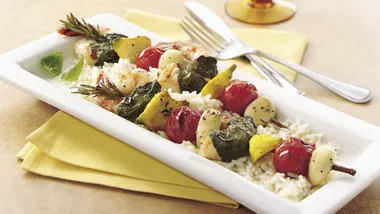 To assemble skewers, alternately thread fruit onto wooden skewers. Place skewers onto grill. Grill, turning and brushing with glaze, until fruit is softened and heated through (4 to 6 minutes).