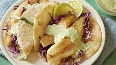 Coconut Bread Fish Tacos with Tomatillo and Avocado Sauce