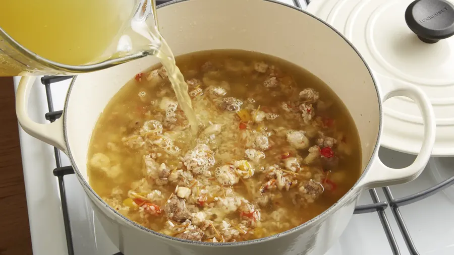 n a large pot, at low heat, combine the vegetables and meats, noodles and lastly the 3 cups of rice, and stir well. Add the 6 cups of water, salt to taste and the color and chicken bouillon. Cook rice until water has evaporated for approximately 20 to 30 minutes. Lower heat and cover pot. Cook for another 20 minutes.