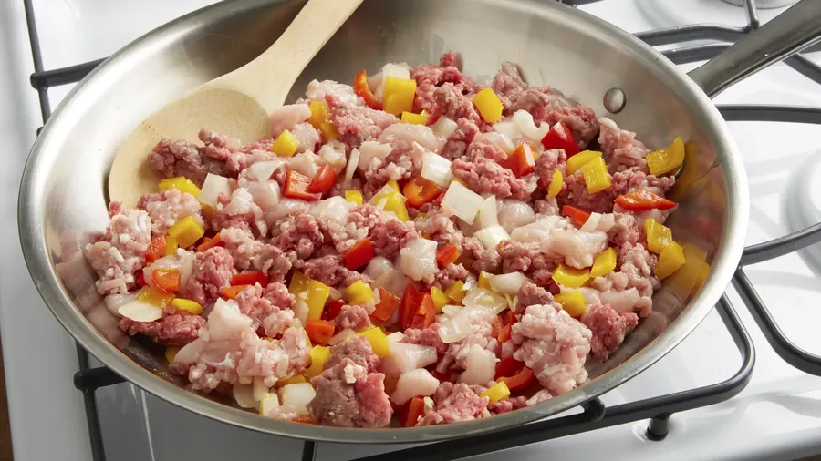 In large saucepan, pour two tablespoons of canola oil to medium heat. Add peppers, garlic and onion. As soon as they are golden, add the meats (pork, beef and chicken), and stir-fry. Stir well and allow the meats to cook completely, for about 10 minutes or until the meat is no longer pink.