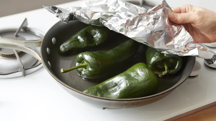 Add poblano peppers to first pan, cover loosely with foil paper. This is a stovetop method for charring the peppers. As they get hot, the oil will pop and crackle a bit. Cook for 15 to 20 minutes, turning as needed. Transfer to plastic bag to steep and cool.