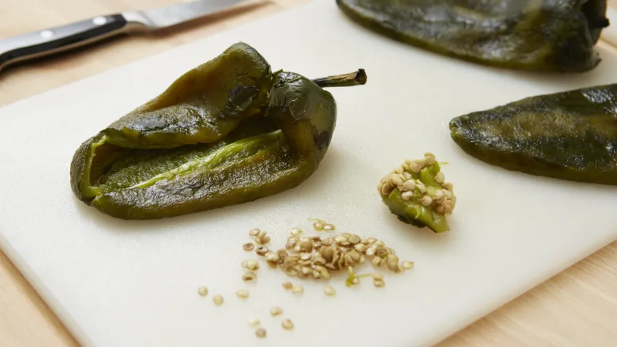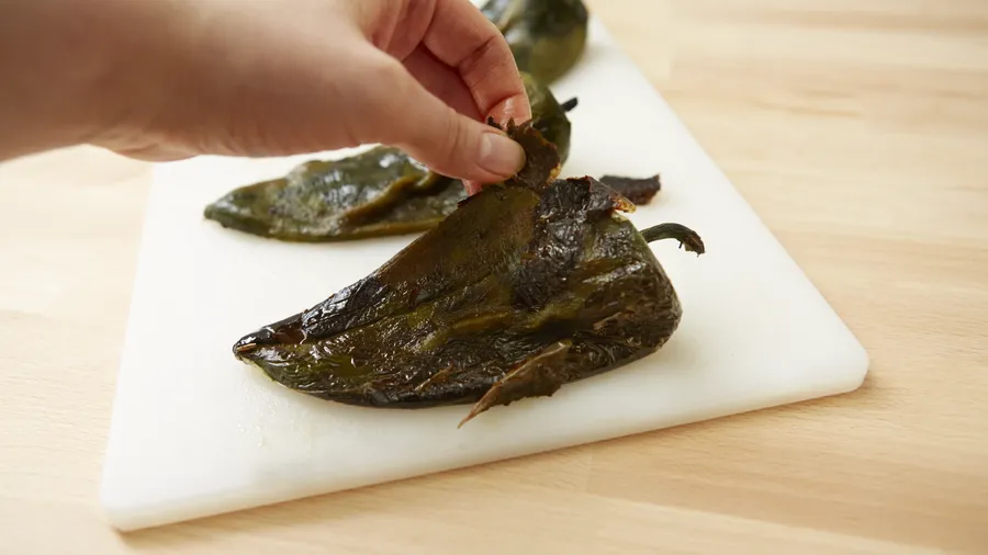 Peel off blistered skins from the peppers, careful not to tear them. Cut a slit down one side and remove the seeds and membranes. Divide the filling among the peppers; do not overstuff.