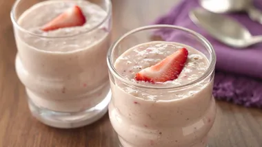 Sprinkle with remaining sunflower nuts. Top each with strawberry.