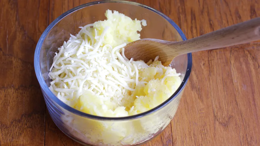 Drain them, press them and add the beaten egg, salt, pepper and mozzarella cheese.