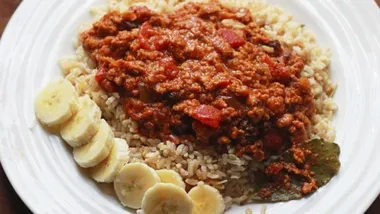 In a large pan, heat the oil over low to medium heat and cook onions until translucent. Add chopped bell pepper and continue to sauté. Add beef and brown, draining excessive fat if necessary. Add diced tomatoes, raisins, garlic, and seasonings, mixing well to incorporate all the flavors.