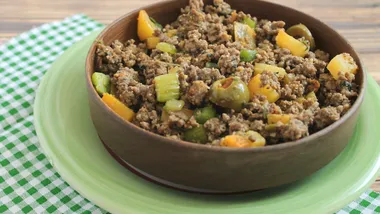 Red bell peppers are a staple in many Latin American recipes. In this recipe, I decided to stuff my bell peppers with a traditional Cuban picadillo mixture. I grew up enjoying Cuban picadillo: it’s easy, quick, and affordable to feed a large family.