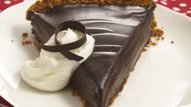 Garnish cake by piping on sweetened whipped cream and adding chocolate-covered coffee beans.