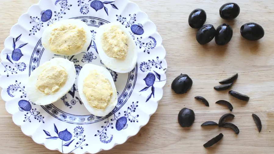 Once the eggs are stuffed, cut the black olives in half. One half will be the spider’s body. Cut the other half lengthwise into 8 slices, which will be the spider’s legs.