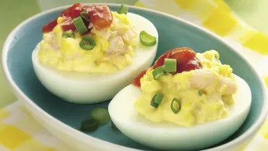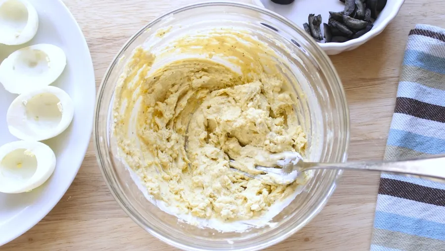 Remove the egg yolks and place them in a bowl. Using a fork, mix the eggs. Add the mayo and mustard, and season with salt and pepper to taste. Mix all of these ingredients and use a small spoon to stuff the egg whites.
