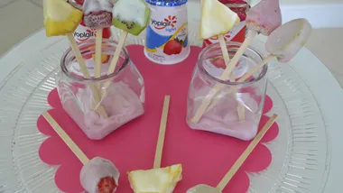 Freeze for 15 minutes for yogurt to harden a bit. Insert wooden popsicle sticks in each cup, return to freezer and freeze until firm, for 4 hours.