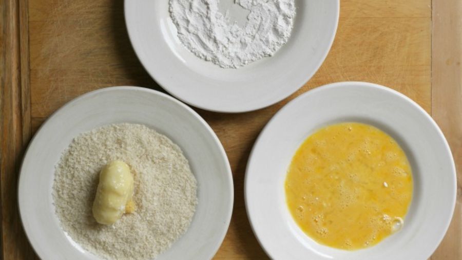 Roll each ball in flour, then cover them in the beaten egg and roll them with bread crumbs.