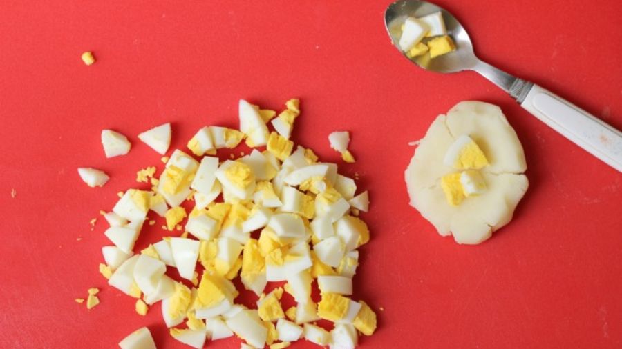 Press the center of the ball and fill it with some of the cooked egg.