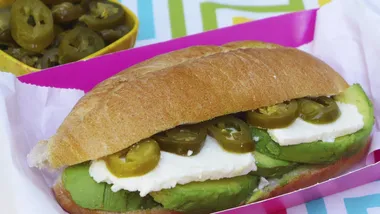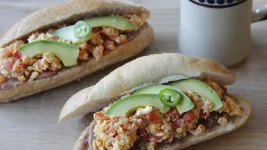 Take 1 slice of bread and apply the mint and avocado spread to taste. Add the scrambled eggs, tomatoes, and jalapeños, if you decide to use them. Cover with another slice of bread, mint spread, eggs, tomatoes, jalapeños, and the last slice of bread. Repeat the process to make another sandwich.