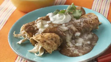 Drench them in the bean sauce, add the Mexican cream to taste and some onions; sprinkle with grated aged cheese, and garnish with avocado slices and cilantro sprigs.
