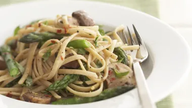 While fettuccine is cooking, heat oil in 12-inch skillet over medium heat. Cook asparagus, mushrooms, garlic, parsley and basil in oil 5 minutes, stirring occasionally. Stir in tomatoes. Simmer 2 to 3 minutes or until tomatoes are heated.