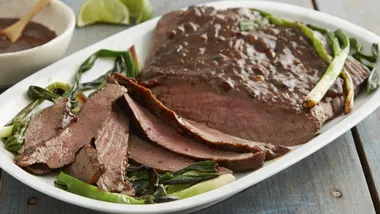 Place steak on cutting board; remove strings. Cut steak into slices; serve with sauce.