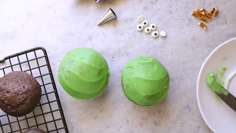 Using a knife or a small spatula, cover the cupcakes completely with green frosting. Let them sit for a few minutes.