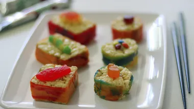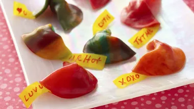 Use 3 to 4 Betty Crocker Fruit Gushers for each chile pepper. Unroll and remove paper from Betty Crocker Fruit Roll-Ups. Cut in half, separating yellow from red and separating blue from green. Cut each red and yellow piece into 2 squares. Place 3 Betty Crocker Fruit Gushers on square, and shape it around Gushers to look like chile pepper shape. Use green Betty Crocker Fruit Roll-Ups to make stems.