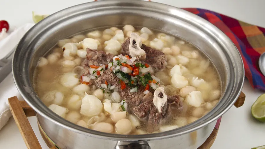 The gallina pinta soup is originally from Sonora, Mexico. It’s made with beef, which is simmered for a long time to release all its flavors and soften the pinto beans and pozolero corn. The broth ends up being incredibly delicious with ingredients like onion, garlic and chiles. It’s served with a salsa made from raw onions, peppers and herbs that give it an extra touch of flavor and color.