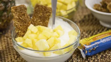 • Healthy snacking is just minutes away! Fresh fruit is coated in yogurt and rolled in crunchy granola.
