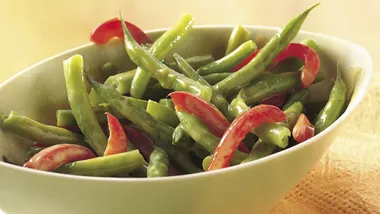 Gently sauté a pretty medley of frozen green beans and fresh sweet pepper strips, accented with herbs and a spritz of lemon.
