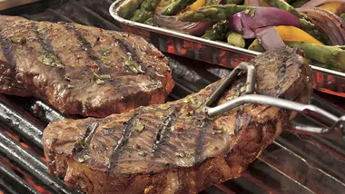 Heat gas or charcoal grill. Remove steak from marinade; reserve marinade. Sprinkle steak with cracked black pepper. Place steak on grill over medium heat. Cover grill; cook 15 to 18 minutes or until desired doneness, turning halfway through grilling. Let stand 5 minutes.