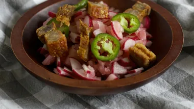 Place the sliced lemon on the grill and cook for 3 minutes until grill marks form. Squeeze to dress the radishes with lemon juice.