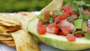 Pre-heat the grill and place four slices of watermelon. Grill for a few minutes, until you can see the grill marks. Dice it and mix with the rest of the ingredients.