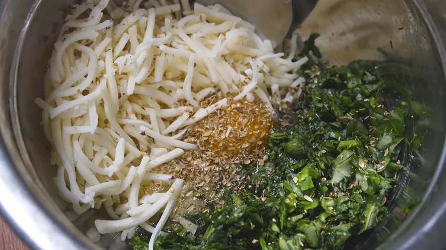 Finely chop the spinach and mix it with the egg, mozzarella cheese, oregano, salt, and pepper. You can use your hands or a food processor to do this, but try to leave the dough a bit thick and don’t grind it too much.