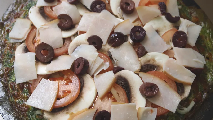 Ham and Mushroom Pizza with Cheese and Spinach Dough