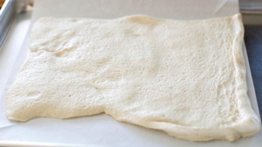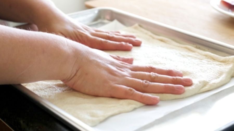 Using your hands, stretch out the dough to an even thickness.